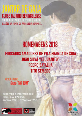 Neste jantar serão homenageados pelo Clube Taurino Beringelense o GRUPO DE FORCADOS AMADORES DE VILA FRANCA DE XIRA, o novilheiros JOÃO SILVA "EL JUANITO", o fotografo PEDRO BATALHA e o cavaleiro TITO SEMEDO.